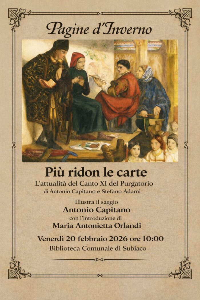 Aver partecipato, lo scorso 23 gennaio, alla presentazione di Più ridon le carte presso il Centro Sportivo Renato Scrocca di Villalba ha significato entrare in un dialogo vivo con Dante e con il presente. Non una semplice introduzione a un libro, ma un’esperienza capace di suggerire connessioni profonde, di quelle che continuano a lavorare dentro anche dopo che le parole si sono posate.