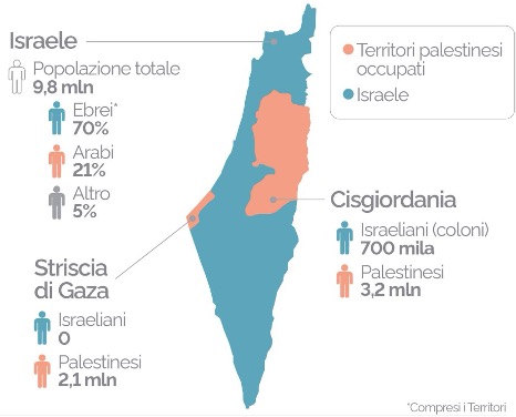 La mappa demografica di Israele e i Territori Occupati prima dell’attacco del 7 ottobre (fonte Israeli Central Bureau of Statistic, Anp)