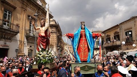 Questa gioia preparata, attesa, come s’attende la primavera, esplode poi la Domenica mattina quando si celebrano alcuni dei riti più affascinanti: la “A Maronna Vasa Vasa” a Modica che è del tutto simile a quella che svolge ad Aragona, “L’incontro pasquale”, dove il nome del rito cambia mantenendo la stessa sostanza: la Madonna che piangendo corre incontro per una, due, tre volte al Figlio e, solo al terzo bacio, il velo nero della morte cade a terra in mezzo all’esplosione di gioia del paese.