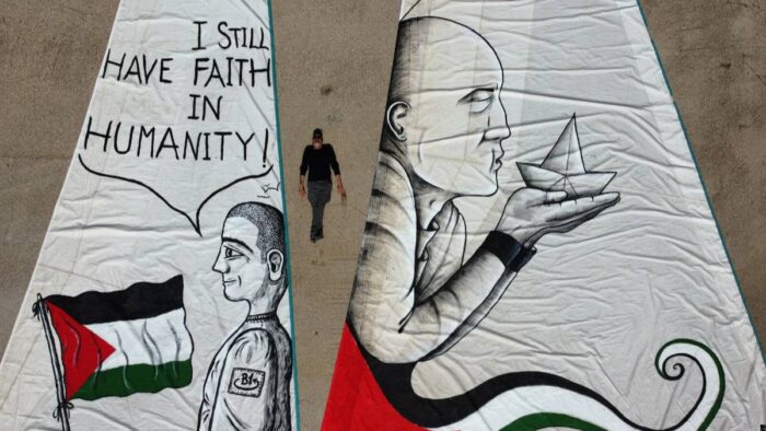 Agli alberi di 22 navi della Global Sumud Flotilla, si issano vele dipinte da 21 artisti italiani e spagnoli. Il progetto artistico a sostegno della missione umanitaria.